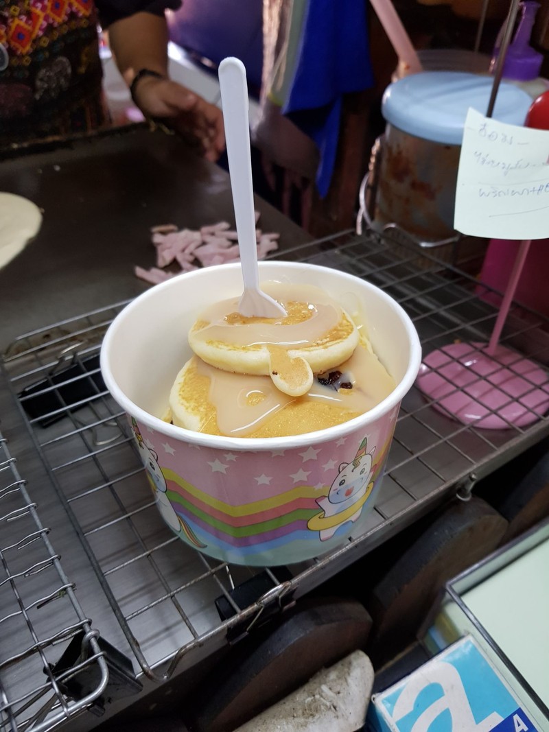 ร้านนี้ผ่านหลายทีก็เห็นคนยืนรอเยอะตลอด ยิ่งช่วงเปิดเทอมคนยิ่งเยอะ วันนี้ได้มีโอกาสมาลองดู จุดเด่นของร้านอยู่ที่มีเมนูให้เลือกหลากหลาย เครื่องมีหลายแบบ ทำให้เราสร้างเมนูใหม่เองก็ได้ และคนขายคุยเก่งใจดี เด็กๆเลยชอบ จากที่ได้ลองทานเมนู - แพนเค้ก (35฿) เมนูนี้เห็นทางคนขายบอกทำวันละ5ชุดเท่านั้น เพราะทำใช้เวลานาน ครบ5ชุดก็ไม่ขายแล้ว จะเลือกได้ว่าราด ช็อกโกแลต หรือ นมข้น หรือจะราดทั้งสองเลยก็ได้ รสชา...อ่านต่อ