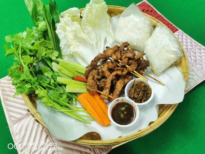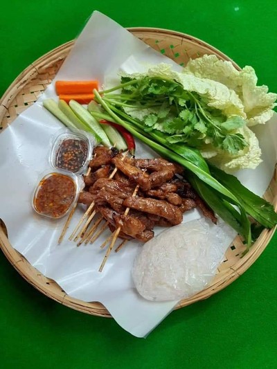 ชุดหมูไซส์ S หมู 5 ไม้+ข้าวเหนียว 1 ห่อ พริกกับผักพร้อมนํ้าจิ้มเเจ่ว+นํ้าจิ้มปลาร้า(ฟรีในชุด)