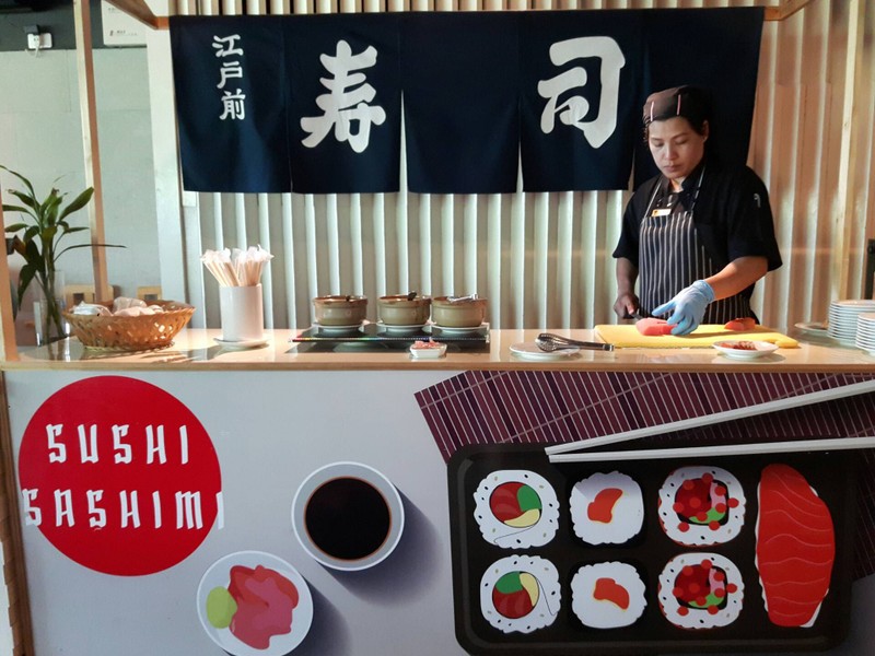 มาเลี้ยงส่งน้องที่ทำงาน อาหารบุฟเฟ่ต์กลางวัน บวก vat ตกราคา คนละ 466 บาท เมนูมีเยอะหลายอย่าง 1. ไก่สเต้ะ มีขนมปังน้ำจิ้มอะจาด เราทานไป 3 ไม้ อาจจะแข็งหน่อย หากเทียบกับหมู พอทานได้ค่ะ 2. ซูชิ มีปลาแซลมอน และทูน่า ใช้ได้ค่ะ มีไข่หวาน ปลาซาบะ ปูอัดด้วย แต่เราทานแต่ปลา 3. ทอดมัน ไก่ย่าง มีน้ำจิ้มหวานราด รสขาติโอเคเลย 4. กุ้งลวก รสชาติใช่ได้กุ้งสด แกะลำบากนิดนึง ตัวไม่ใหญ่มาก 5.เมี่ยงคำ ทานไป 4 คำ...อ่านต่อ