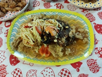 ร้านส้มตำที่เด่นเรื่องอาหารปิ้งย่างมากเลย น้ำจิ้มแจ่วก็อร่อยมีข้าวคั่วเยอะๆ ที่ติดใจสุดและแนะนำ คือ หมูร้องไห้ เมนูอื่นที่เพิ่งเคยสั่งวันนี้ คือ ส้มตำปลาดุกฟู ส้มตำไทยรสอร่อย กลมกล่อม ถั่วลิสงดูดี ปลาดุกฟูแยกมาทำมากรุบกรอบทานได้เกือบทั้งตัวยกเว้นหัวและปลายหาง ต้มโคล้งที่นี่ก็รสชาติดีเลย สั่งหลายครั้งแล้ว ครั้งนี้สั่งต้มโคล้งเห็ด ให้เห็ดเยอะมาก เสียดายที่ข้าวเหนียวแข็งไปนิด ไม่ได้แวะมานาน...อ่านต่อ
