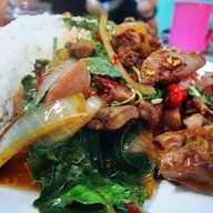 กะเพราถาดพริกแห้งสูตรคุณแม่(ใช้ข้าวหอมมะลิแท้ตราไดโนเสาร์)