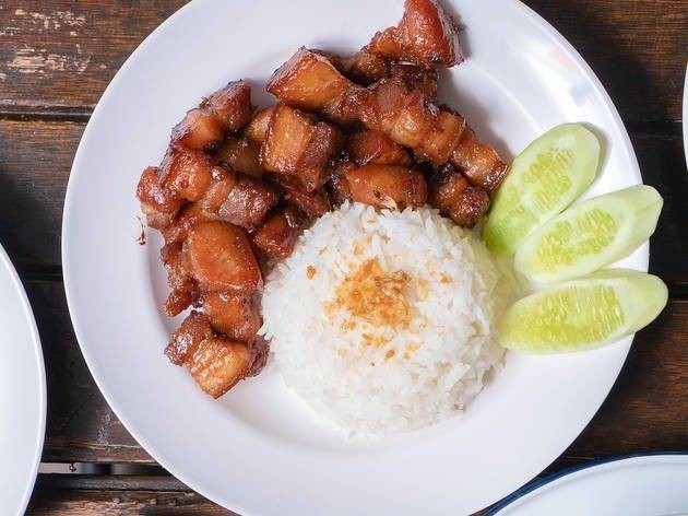 ข้าวราดหมูสามชั้นทอดน้ำปลา