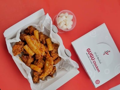 ไก่ทอด ต๊กบ๊กกี GU GU CHICKEN อร่อยมากค่ะ ไก่ทอดรสชาติกลมกล่อม ไม่เผ็ดมาก ไก่กรอบ ไม่มันมาก สำหรับไก่ทอดสไตล์เกาหลีของร้านนี้สามารถเลือกความเผ็ดของซอสได้ค่ะ ไก่ทอดชิ้นโต ไก่กรอบอร่อยมาก ในกล่องจะมีต๊อกมาด้วยเพิ่มความเหนียวหนุบหนับอร่อยมากค่ะ ร้านนี้มีหลายสาขาค่ะดูเพิ่มเติม