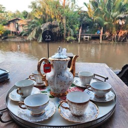 เป็น cafe and restaurant ที่อยู่ติดคลองในโซนของอัมพวา สถานที่ตกแต่งสวยมาก ถ้าใครชอบถ่ายรูป แนะนำที่นี่เลย อาหารมีให้เลือกหลายอย่าง น่าทานหลายเมนู ของหวาน ชุดเซ็ตอาฟเตอร์นูนทีก็จัดจานมาสวยงาม เครื่องดื่มปั่นแก้วใหญ่มาก ใหญ่ที่สุดที่เคยเจอมาเลย ตอนแรกเห็นราคา คิดว่าค่อนข้างแพง แต่เทียบกับปริมาณก็พอเข้าใจได้ โต๊ะโซนห้องแอร์ด้านใน นั่งติดริมหน้าต่าง ส่วนด้านนอก อากาศจะร้อนหน่อย แต่ร้านมีพัดลมให้ ...อ่านต่อ