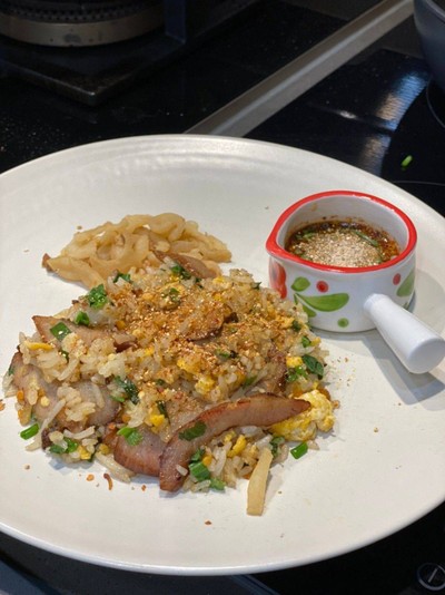 ข้าวผัดคอหมูย่างรสดั้งเดิม ผัดกับน้ำจิ้มแจ่วสูตรเด็ดเฉพาะของทางร้าน โรยด้วยผงข้าวคั่วรสเผ็ด ทานคู่กับกากเจียวกรุบกรอบ เข้ากันสุดๆ
