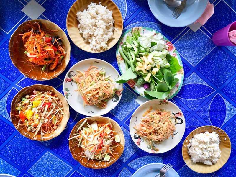 ไม่เคยกินส้มตำทุเรียนมาก่อน พอมากินที่นี่ หืม...อร่อยมาก มันด้วย กินกับข้าวมันก็เค็มๆ มันๆ ปะแล่มๆ ผักที่นี่ปลูกเอง ปล่อยขึ้นในสวน เค้าเป็นสวนปลอดสารพิษตัวอย่าง อยู่ในโครงการเศรษฐกิจพอเพียง คนมาดูงานที่นี่เยอะเลยดูเพิ่มเติม