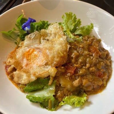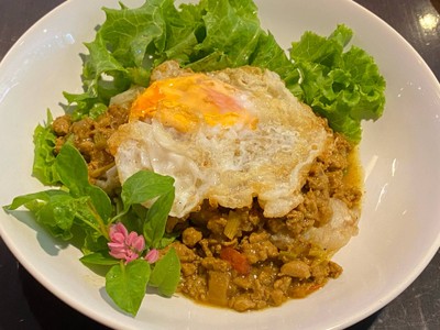 Fried rice noodle topped with minced pork in light curry sauce and fried egg