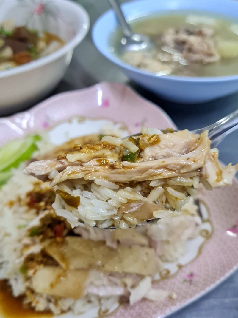 ร้านข้าวมันไก่อีกร้านบนถนนสาธุฯ ร้านนี้ดังสู้ร้านอื่นไม่ได้ คนไม่ค่อยพูดถึงเท่าไร วันนี้สั่งไก่สับส่วนอก+น่องจานกลาง 70 บาท เนื้อไก่นุ่มแต่ไม่มาก น้ำจิ้มยังไม่ค่อยโดนใจเท่าไร ที่ชอบที่สุดคือน้ำซุป ให้มาถ้วยใหญ่เลย ซดได้เรื่อยๆ ชอบเพราะตัวซุปไม่ค่อยมัน ที่ร้านมีก๋วยจั๊บขายด้วย แต่วันนี้ไม่ชิมค่ะดูเพิ่มเติม
