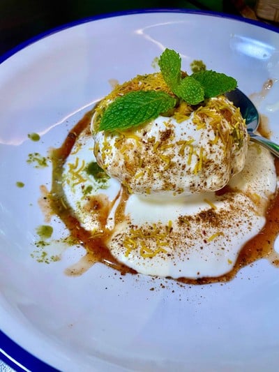 แป้งกรอบ ทรงกลมยัดไส้ถั่วแบะเครื่องเทศ ราดโยเกิร์ต ซอสเปรี้ยว และเครื่องเทศ