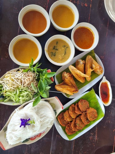 33% ของรีวิวบอกว่าร้านนี้เหมาะกับ คู่รักขนมจีนปลายนา อยู่หนองบัว ร้านบรรยากาศบ้านทุ่ง ขนมจีนที่นี่มีให้เลือกเป็นชุดๆ เลือกน้ำยาได้ตามที่เราต้องการ ชุดที่สั่ง ขนมจีนชุดใหญ่ 159 ได้น้ำยา 4 ถ้วย ส่วนตัวว่าน้ำยาติดหวานนำไปนิด ใครมาคนเดียว มีแบบจานเดียว ให้เลือกทานได้ ทอดมัน 69 บาท ทานคู่ขนมจีน ไข่ต้มเพิ่มฟองล่ะ 10 บาท ที่นั่ง มีแบบนั่งพื้นเป็นศาลา และแบบโต๊ะนั่งดูเพิ่มเติม