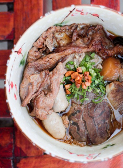 ประกอบด้วย ลูกชิ้น เนื้อสด เนื้อเปื่อย ขาลาย เอ็นแก้ว เสือไห้เบิร์นไฟ (ถ้าเนื้อบางส่วนทางร้านหมดจะได้เนื้อส่วนอื่นแทน) - ผักประกอบด้วย ผักบุ้ง ถั่วงอก ผักชีฝรั่ง - โรยหน้าด้วย กระเทียมเจียว - ทางร้านไม่มีน้ำใส น้ำตก มีแต่น้ำข้นจากการตุ๋นเนื้อ