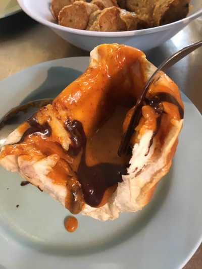 มาเยาวราชมาเห็นคนต่อคิวกันซื้อขนมปังเยอะมาก เลยมาลองซะหน่อย ขนมปังร้อนๆ ไส้เยิ้มๆ แบบไหลเลยอ่ะ ไส้ขนมปังก็มีให้เลือก ทั้ง เนย น้ำตาล ช็อกโกแลต สังขยา พริกเผา แยมสตอเบอรี่ แยมส้ม แยมสัปะรด ขนมปังจะเป็นแบบ กรอบนอกนุ่มใน ราคา เนยน้ำตาล 20 บาท เพิ่มไส้ 25 บาท กินร้อนๆ จะอร่อย ฟิน แต่ถ้าทิ้งไว้นานๆ ขนมปังจะค่อนข้างแข็ง แต่โดยรวมถือว่าดีดูเพิ่มเติม