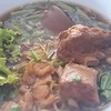 มีโอกาสได้มาลองสักทีกับก๋วยเตี๋ยวเจ้าดังของลำพูน ถามคนขายว่าส่วนใหญ่สั่งอะไรกัน เค้าก็แนะนำก๋วยเตี๋ยวหมูตุ๋นแบบน้ำ กับแบบแห้งโบราณ เลยขอทดลองแบบน้ำก่อนละกัน..เส้นเล็กน้ำหมูตุ๋น รสชาตินน้ำซุปค่อนข้างจืด ต้องปรุงเพิ่มอีกเยอะเลย หมูตุ๋นเปื่อยดี ปริมาณที่ให้มาก็สมกับราคาไม่น้อยจนเกินไป นอกเหนือจากก๋วยเตี๋ยวแล้วยังมี ซาลาเปา ขนมจีบ น้ำดื่มต่างๆดูเพิ่มเติม