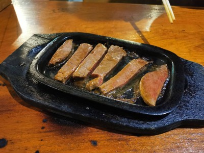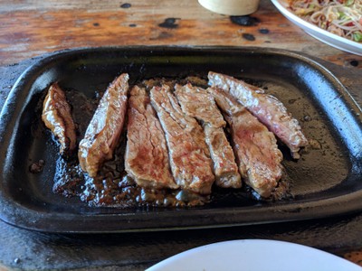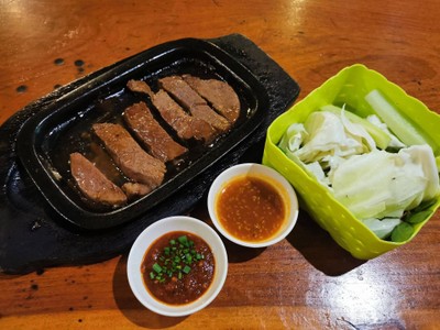 มาสกลนครแหล่งเนื้อโคขุนโพนยางคำ ร้านนี้ต้องอยู่ในลิสที่ห้ามพลาดกันเลยทีเดียวค่ะ 1.สันในกะทะร้อน (240บาท) เนื้อนุ่ม ไร้มัน สุกกำลังดีในกะทะร้อนค่ะ ทานแล้วมันฟินจริงๆ 2.สันนอกเนื้อทองดำ (ลูกผสมวากิว) กะทะร้อน 200 g. (750บาท) สันในกะทะร้อนเริ่ดแล้ว จานนี้ดีงามมากๆ เนื้อนุ่มละมากๆๆ ละลายเลยค่ะ สันนอกจะมีมันตรงขอบๆนิดหน่อยไม่ชอบตัดออกไปได้ค่ะ 3.ก้อยหมูทอด (80บาท) ลักษณะจะคล้ายๆลาบทอด แต่สมุนไพรจะเย...อ่านต่อ