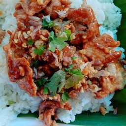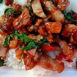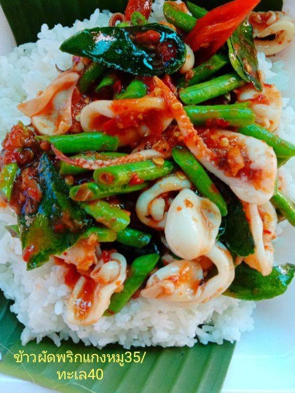 กะเพราถาดพริกแห้งสูตรคุณแม่(ใช้ข้าวหอมมะลิแท้ตราไดโนเสาร์)