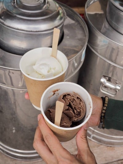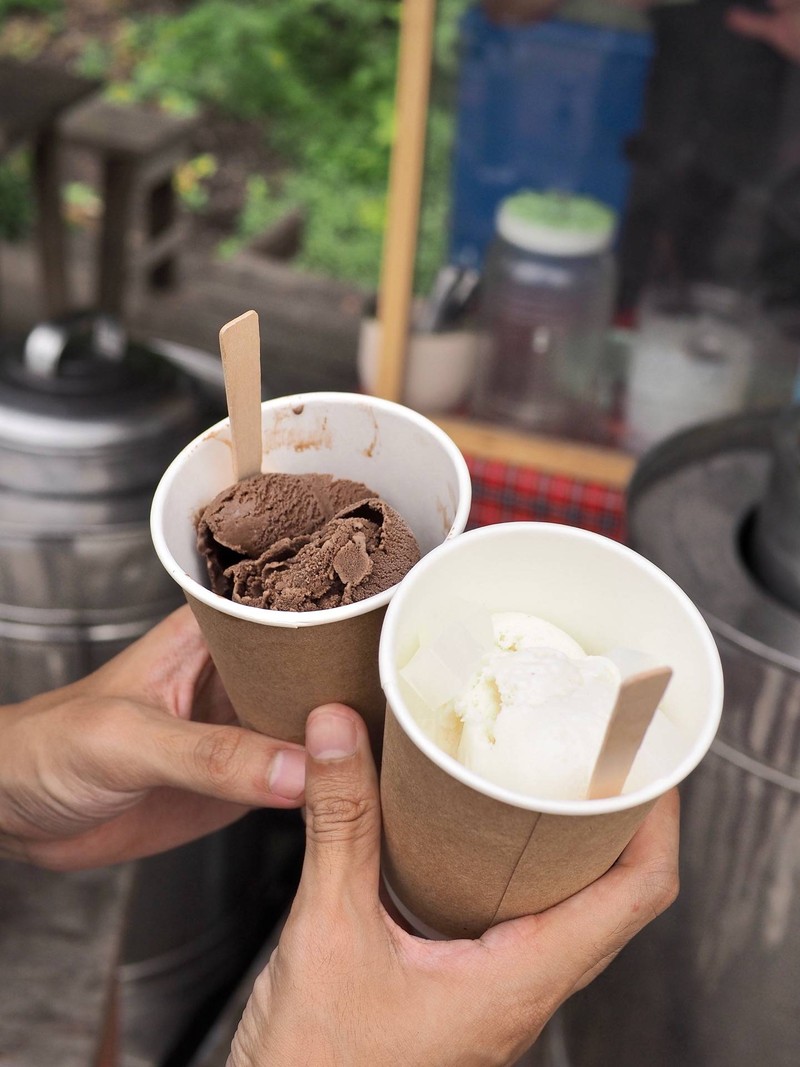 100% ของรีวิวบอกว่าร้านนี้เหมาะกับ เดลิเวอรีก่อนกลับกรุงเทพ แวะร้านไอติมเป็นร้านสุดท้าย ร้านเป็นเพิงเล็กๆอยู่ริมถนน แต่คนเยอะมากเลยนะ มีที่นั่งอยู่ 1 โต๊ะได้ เผื่อใครอยากนั่งกินที่ร้านชมวิวสวนด้านหลัง ไอติมมี 2 รสชาติ ถ้วยละ 30 บาท 🥥 กะทิ หอมมัน เข้มข้น เหมือนมีมะพร้าวขูดมาช่วยเพิ่ม texture แบบเบาๆ 🍫 ช็อคโกแล็ต มีความเข้มแบบล้ำลึก ไม่เหมือนที่เคยกินมาดูเพิ่มเติม