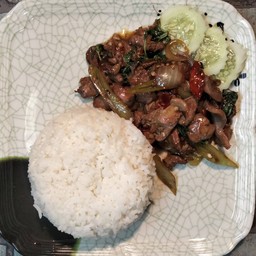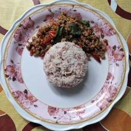กะเพราถาดพริกแห้งสูตรคุณแม่(ใช้ข้าวหอมมะลิแท้ตราไดโนเสาร์)