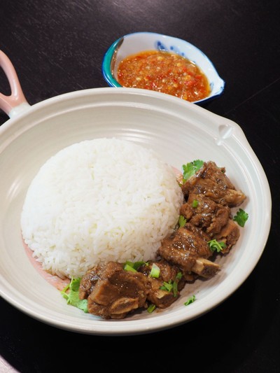 กระดูกหมูผัดกับเครื่องสามเกลอจนได้ที่ เติมน้ำซุป ปรุงรส แล้วนำไปตุ๋นในหม้อจนนุ่ม เสริฟพร้อมข้าวหอมมะลิ และ น้ำจิ้มซีฟู๊ด