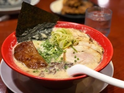 ราเมนในซุปกระดูกหมูน้ำข้น เสิร์ฟพร้อมหมูชาชู เห็ดหูหนูหั่นฝอย สาหร่ายแผ่น โรยด้วยต้นหอมไทย