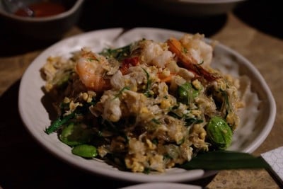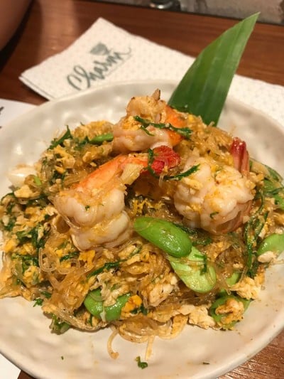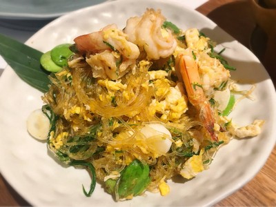 Stir Fried Glass Noodle with Acacia, Southern Wild Bean, Garlic Pickle and Shrimp