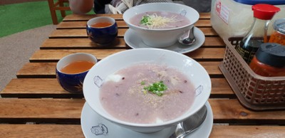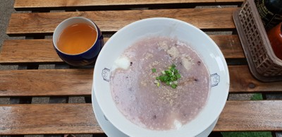 โจ๊กข้าวนิลสีม่วงอร่าม หน้าตาน่าทาน เหมาะกับสายสุขภสพ เนื้อโจ๊กเนียนละเอียด รสชาติค่อนข้างจืดเน้นให้ลูกค้าปรุงเอง มีเครื่องปรุงให้เป็น พริก น้ำปลา หมี่ทอด หมูก็ให้เยอะ ไข่ไม่เป็นยางมะตูมไม่สุกหมดไข่แดงยังออกส้มๆ แต่ไม่ไหลออกมา มีน้ำชาร้อนใส่ถ้วยให้ หอมกลิ่นชาทานร่วมกันให้ความรู้สึกสดชื่นโดยเฉพสะวันฝนตกดูเพิ่มเติม