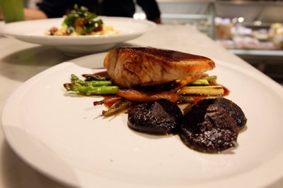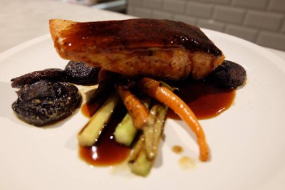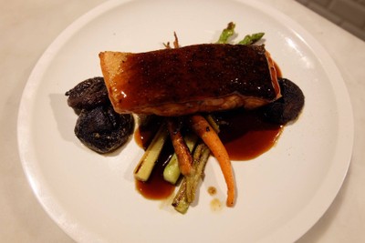 Fresh Salmon, Snap Pea, Shiitake Mushroom, Baby Carrot, Red Radish, Sesame Seed, Teriyaki Glaze