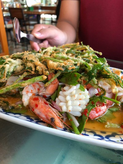 บรรยากาศร้านน่านั่ง มีทั้ง indoor ซึ่งติดแอร์เย็นสบาย และ outdoor ที่เหมาะกับการพบปะพูดคุยกลุ่มใหญ่ๆ ทางร้านมีบริการที่จอดรถ ซึ่งอยู่บริเวณด้านข้างของร้าน โดยลูกค้าสามารถเลี้ยวซ้ายเข้ามาจอดได้เลยค่ะ ...อาหารในร้าน มีทั้งของคาวและของหวาน ซึ่งที่สั่งมาทาน ก็อร่อยดีนะคะ เมนูที่ทานคือ 1. ผัดผักเหมียงไข่ กุ้งเสียบ - ให้กุ้งเสียบเยอะดีค่ะ รสชาดเค็มๆ หอมไข่ 2. ยำผักบุ้งกรอบ กุ้งสด - รสชาดกลมกล่อม ไ...อ่านต่อ