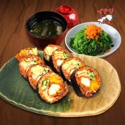ร้านอาหารญี่ปุ่นอินาริ สั่งแบบเดลิเวอรี่ผ่านแอพ มีโปรโมชั่นพิเศษเป็นชุด โรลกุ้มเทมปุระ ข้าวผัดกะเทียมแซลมอนและน้ำซุป ราคา 192 บาท ตัวแซลมอนผัดให้มาพอดีๆพร้อมมะนาวฝาน เนื้อแซลมอนมาแบบพอประมาณ ส่วนโรลเนื้อข้าวมาแบบแน่นๆเลยดูเพิ่มเติม