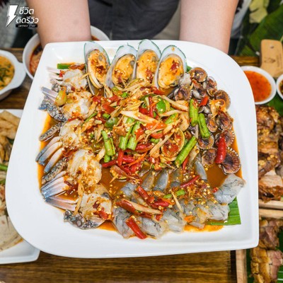 ปลาร้าแซ่บนัว พร้อมหอยแครง, ปูม้าดิบ, กุ้งสด, หอยแมลงภู่นิวซีแลนด์ พร้อมส้มตำปลาร้าหมูยอ