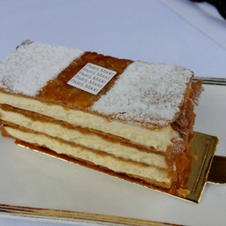 Chef’s light Madagasar vanilla bean cream on layers of caramelized puff pastry