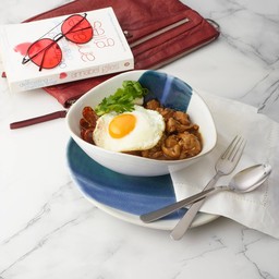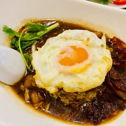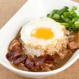 Signature braised chicken in brown sauce topped with fried egg over rice