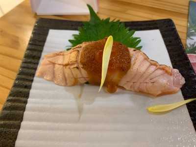 ซูชิหน้าปลาแซลมอน ราดซอสไซเคียว