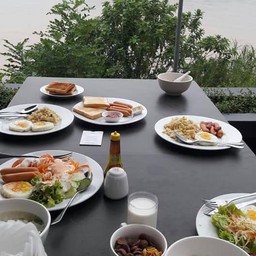 เป็นมื้อเช้าของทางโรงแรม ได้เห็นวิวแม่น้ำโขง ตอนพระอาทิตย์ขึ้น ที่นั่งมีทั้ง ด้านนอกติดระเบียงและด้านใน ถ้าช่วงสายหน่อยแดดจะแรง อาหารเป็นแบบ American Breakfast ทั่วไป ทานตอนประมาณ 8:00 น ของหมดไม่มีเติม ข้าวต้มเย็นชื่อ กับข้าวแทบไม่เหลืออะไร กระเทียมเจียวหมด ยังไม่มีเสริม พนักงานไม่ค่อยสนใจนัก มื้อเย็นของโรงแรมก็มีบริการด้วยดูเพิ่มเติม