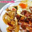 เวลามาพักที่คอนโดเมืองทองตึกโซน C3 -C4 ซึ่งจะมาพักเพราะมาออกอีเว้นส์ที่อิมแพคเมืองทองธานี ซึ่งพ่อค้าแม่ค้าเค้าก็จะพักคอนโดแถวนี้กัน ตื่นเช้าก็ลงมากินข้าวที่ศูนย์อาหารเมืองทองกัน ร้านนี่เป็นร้านแรกที่ตั้งอยู่ในโลเกชั่นได้เปรียบ เพราะอยู่บริเวณ 3 แยก ธนาคารไทยพาณิชย์ เดินไปทางซ้ายก็เจอเป็นร้านหัวมุมพอดี เป็นร้านที่เห็นมีลูกค้ามาอุดหนุนทั้งซื้อกินที่นี่และซื้อกลับเป็นเสบียงยามกลางวันกันเพียบ ร้านนี้มีเมนูเยอะมาก เยอะชนิดว่าต้องเอาปลาทอดกับผักมาวางขายนอกตู้ข้าวแกง แต่ก็เป็นข้อดีอย่างคือ ให้ลูกค้าได้เป็นคนเลือกปลาเอง แทนที่จะให้แม่ค้าเลือกให้ซึ่งอาจจะเลือกไม่ถูกใจลูกค้า แต่อากาศในศูนย์อาหารมันร้อนมาก เลยไม่กล้ากินแกงปักษ์ใต้เผ็ด เสี่ยงจะเป็นร้อนในกลางคัน ตอนแรกว่าจะไม่กิน แต่พอเห็นว่าผัดเผ็ดหอยลาย ซึ่งเป็นของโปรดของอิฉัน เลยหูตาแพรวพราวเลย เพราะในเป็นเมนูโปรด และในศูนย์อาหารนี้มีเพียง 3 ร้านที่ขายเท่านั้น (แต่ร้านนี่จะขายเมนูนี้วันเว้นวัน) เลยไม่รอช้า สั่งมาเจิมเลย โป๊ะไข่ดาวและหมูทอดซึ่งเป็นเมนูโปรด 3 อย่างราดข้าวในราคา 40 บาท รสชาติของผัดเผ็ดหอยลายยังไม่ถึงกับเผ็ดมากจนน้ำหูน้ำตาไหล เผ็ดในระดับกลาง แต่ไม่ถึงกับหวานเลี่ยนมากอย่างที่หลายร้านทำ หอยเกือบทุกฝามีเนื้อหมด ยกเว้นนานๆทีคุณจะแจ็คพ็อตเจอหอยอมดินโคลนปนมาด้วย...แต่ไม่วอรี่อะไรมาก ก็กินติดจนกลายเป็นเจ้าประจำไปแล้ว